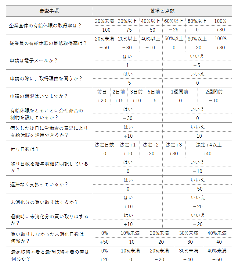 例:審査分野→ワークライフバランス 審査領域→休暇 審査項目→有給休暇
