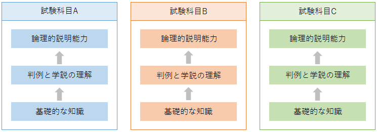 試験は、科目ごとに、問う内容によって、段階分けします。基礎的な知識、判例や学説の理解、論理的説明能力というように3つの段階を設けて、これらの試験を別々に行います。(図1参照)